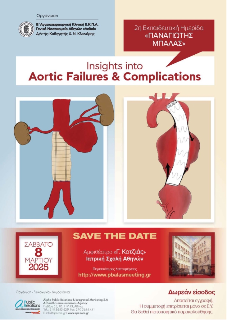 Η Β’ Αγγειοχειρουργική Κλινική Ε.Κ.Π.Α. του Γ.Ν.Α. «Λαϊκό» διοργανώνει την 2ηεπιστημονική ημερίδα «Παναγιώτης Μπάλας» με φετινό θέμα «Insights into Aortic Failures and Complications» στις 8 Μαρτίου 2025 στο Αμφιθέατρο Φυσιολογίας «Γ. Κοτζιάς» (Κτήριο 15) εντός της Ιατρικής Σχολής Αθηνών.