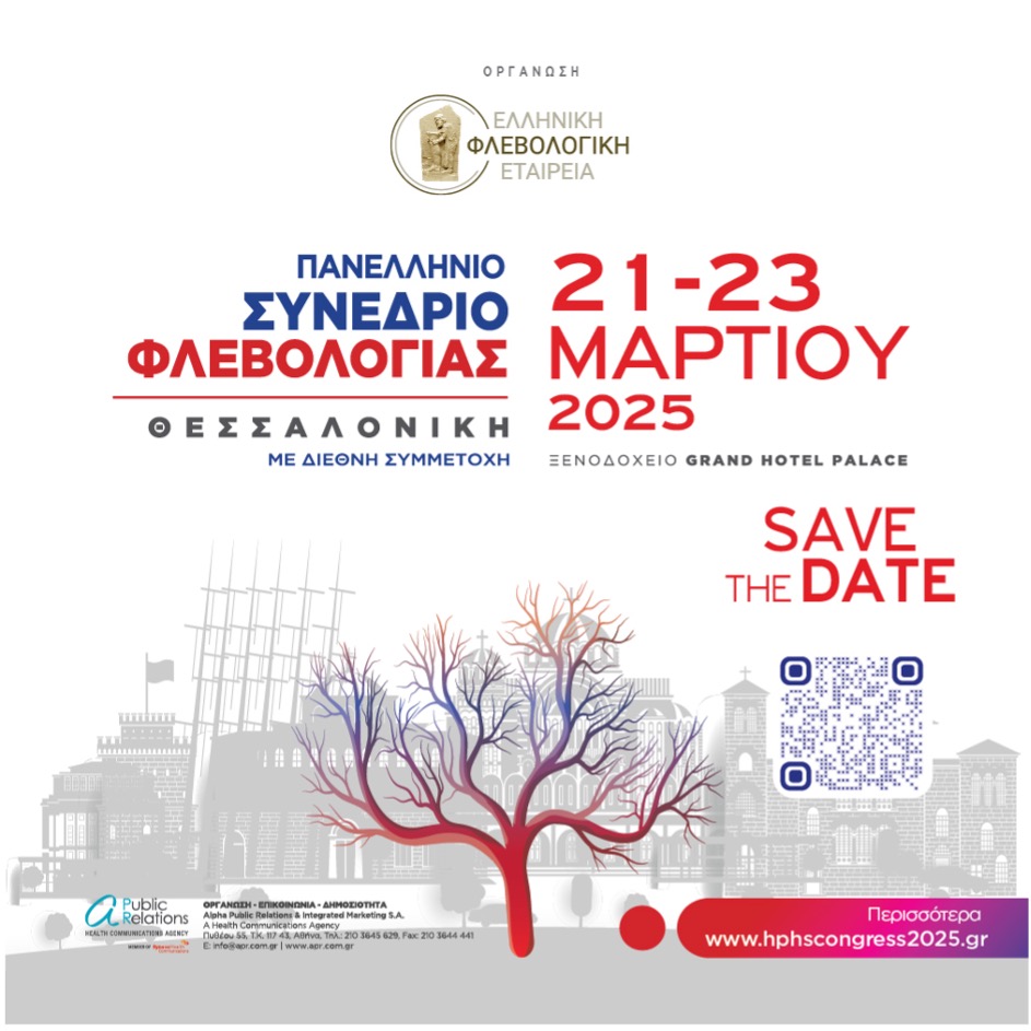 Η Ελληνική Φλεβολογική Εταιρεία διοργανώνει το Πανελλήνιο Συνέδριο Φλεβολογίας στις 2123 Μαρτίου 2025 στη Θεσσαλονίκη (Ξενοδοχείο Grand Hotel Palace).